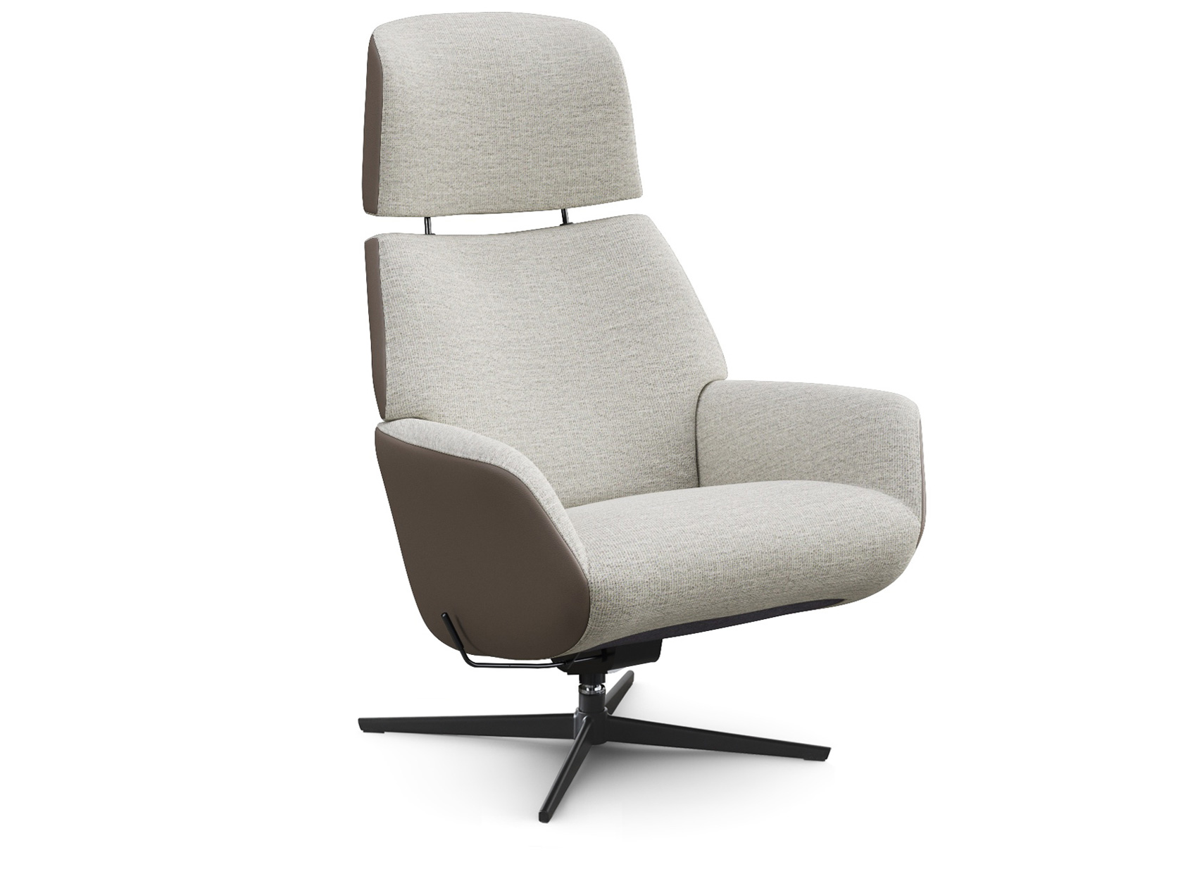 Kebe Designer : Studio Schrofer - Réf. 584 Dimensions : l 87 x h 116,5 x p 78 cm Vitez Plus Combi est la version élégante du fauteuil issu de la collection Kebe Dynamic Lifestyle. Le contraste entre cuir et tissu met en valeur la silhouette contemporaine du modèle. Le mécanisme Dyfosit permet une inclinaison synchronisée du dossier et de l’assise, assurant une transition fluide vers une position de détente. L’appuie-tête réglable en hauteur et inclinable vers l’avant offre un soutien ciblé de la tête et des cervicales. Un fauteuil alliant style affirmé et confort, parfait pour les intérieurs haut de gamme. fauteuil relax et relaxation
