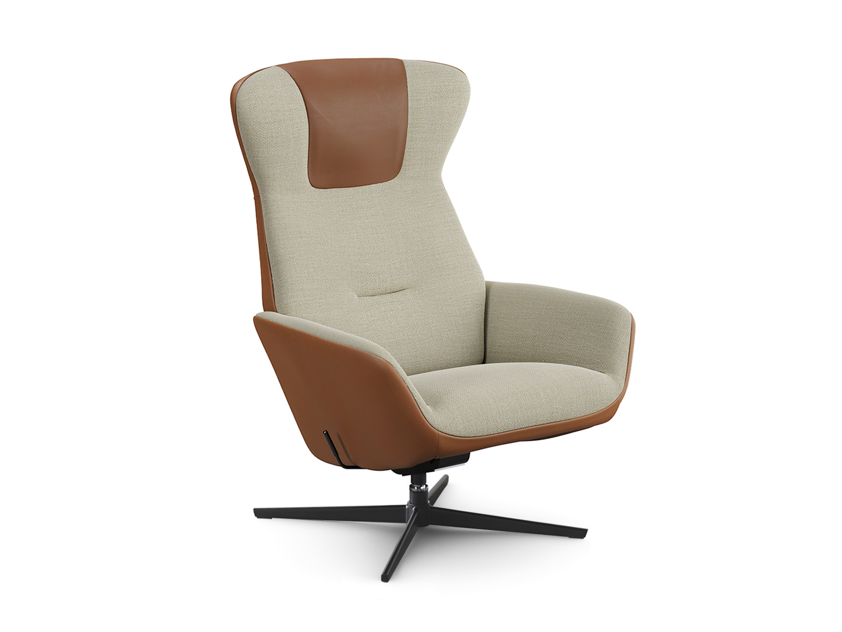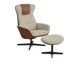 Kebe Designer : Studio Schrofer - Réf. 640 Dimensions : l 77 x h 111,5 x p 88 cm Yani Combi est une version du fauteuil de la collection Kebe Dynamic Lifestyle, associant un revêtement textile sur le dessus à un cuir lisse en dessous. Ce contraste de matières met en valeur la silhouette dynamique et le caractère contemporain du modèle. Il conserve toutes les fonctionnalités de la version de base : dossier haut avec appui-tête, lignes souples et mécanisme Dyfosit permettant l’inclinaison de l’assise et du dossier sous la pression du corps et à l’aide d’une poignée. Un appui-tête réglable est disponible en option. Un repose-pieds Combi assorti complète l’ensemble, fauteuil relax et relaxation